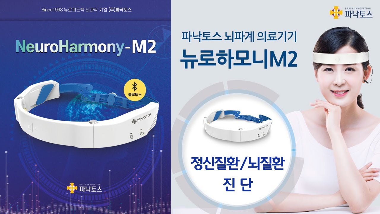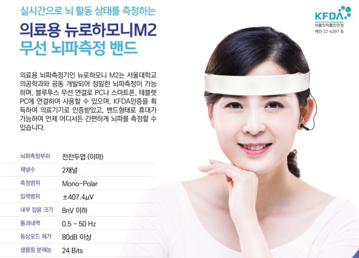 '뉴로하모니M2'는 식약처로부터 뇌파계 의료기기로 정식 인증을 받은 제품으로 뇌파 진단 및 훈련에 사용이 가능하다. 블루투스 방식의 무선 연결이 가능한 2채널 뇌파계 의료기기로, 24 Bit 디지털 분해능과 250 Hz 샘플링 주파수의 성능을 지닌다. 이마 부위인 전전두엽에서 뇌파 측정을 위해 밴드 형태로 되어 있고, 24K 순금을 도금한 건식 전극은 탈부착 방식으로 교체 가능하다. 특히 습식전극을 사용하지 않아 간편하게 뇌파를 측정할 수 있다.