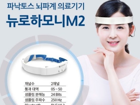 '뉴로하모니M2'는 식약처로부터 뇌파계 의료기기로 정식 인증을 받은 제품으로 뇌파 진단 및 훈련에 사용이 가능하다. 블루투스 방식의 무선 연결이 가능한 2채널 뇌파계 의료기기로, 24 Bit 디지털 분해능과 250 Hz 샘플링 주파수의 성능을 지닌다. 이마 부위인 전전두엽에서 뇌파 측정을 위해 밴드 형태로 되어 있고, 24K 순금을 도금한 건식 …