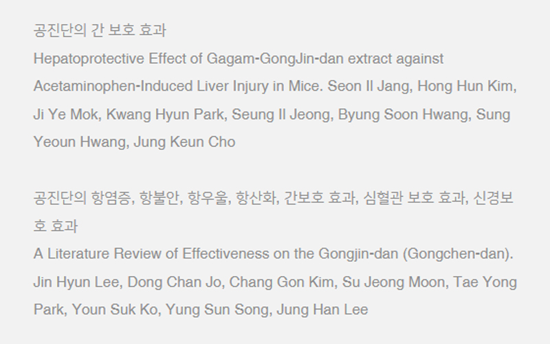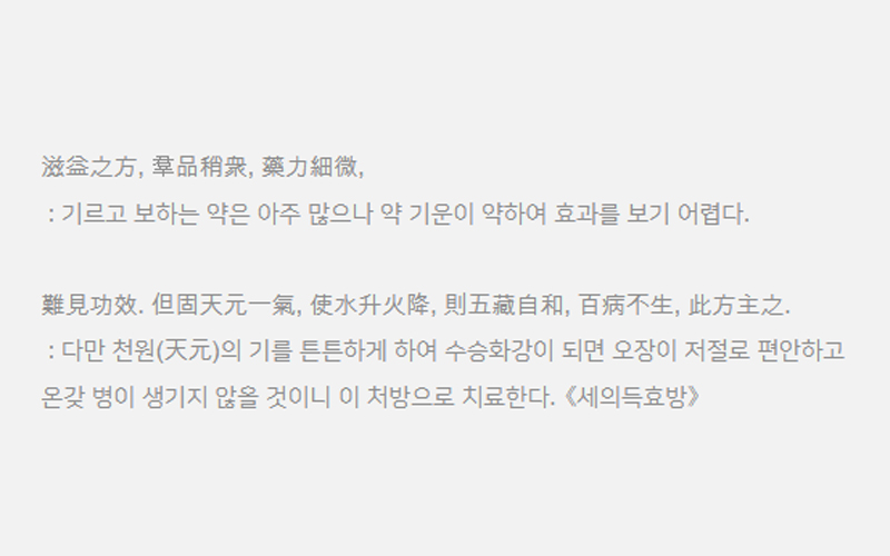 허약한 체질로 태어난 사람이라도 공진단을 꾸준히 복용하면 원기를 아주 단단하게 해줌으로써신수는 올라가게 하고 심화는 내려가게 되니 결국 백병으로부터 자유롭게 된다. - 동의보감 中 -