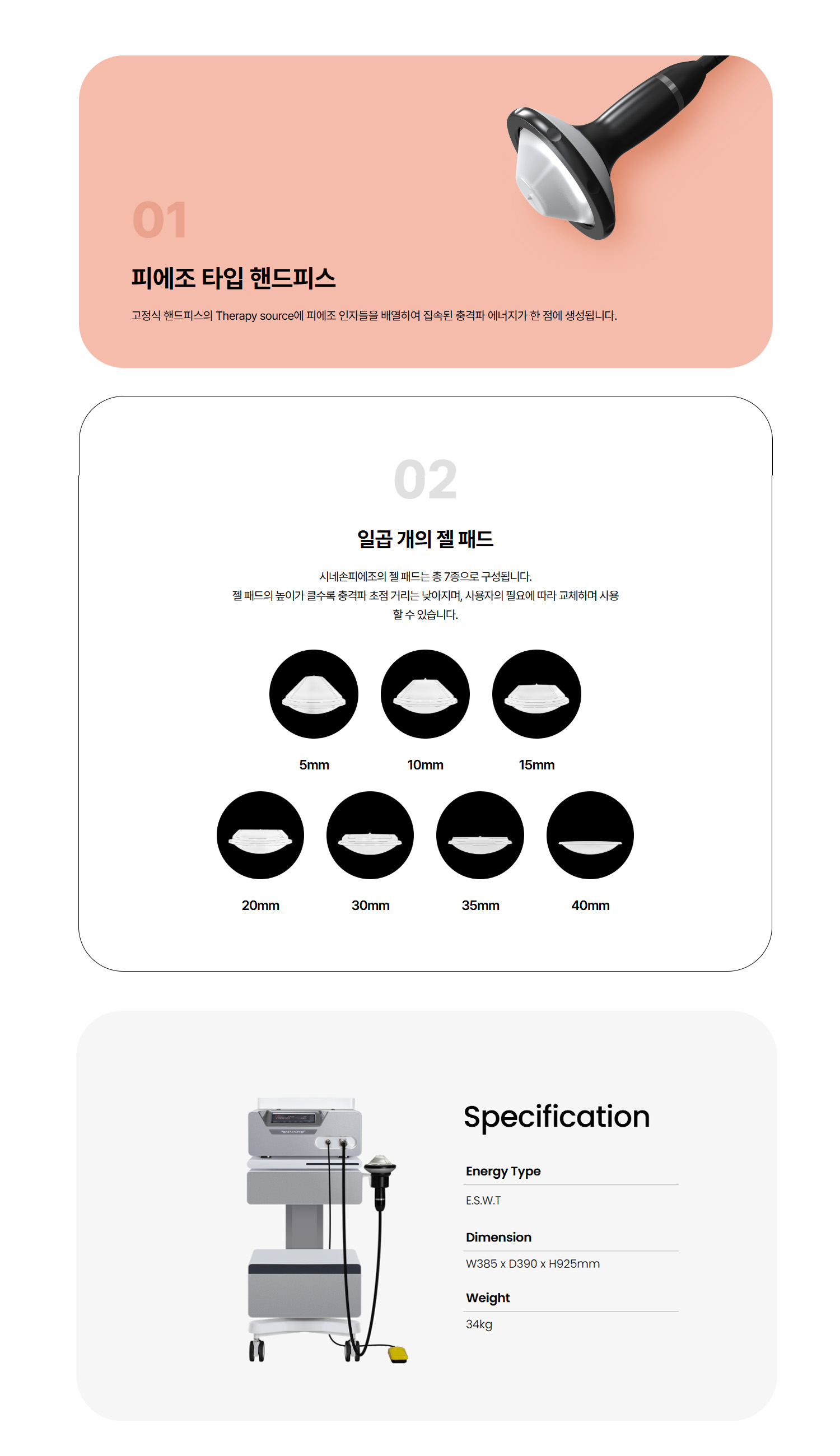 체외충격파 치료(ESWT)는 정형외과, 물리치료, 스포츠 의학에 종합적으로 사용됩니다. 충격파 에너지를 통증 부위에 가해 혈관의 재형성을 돕고 주변 조직과 뼈를 활성화시켜 통증을 감소시키고 치유를 촉진하여 기능개선을 얻을 수 있는 시술법입니다. 여러 나라에서 근골격계 질환치료에 사용되고 있으며 올림픽 경기 기간 중 공식적으로 운동선수를 치료하는 치료법입니다.
