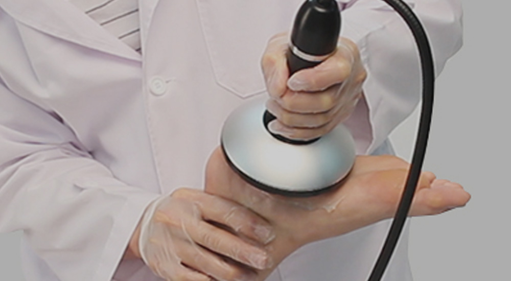 치료 부위에 초음파 젤을 바릅니다. 환자의 상태에 따라 충격파 범위와 깊이를 조절합니다.